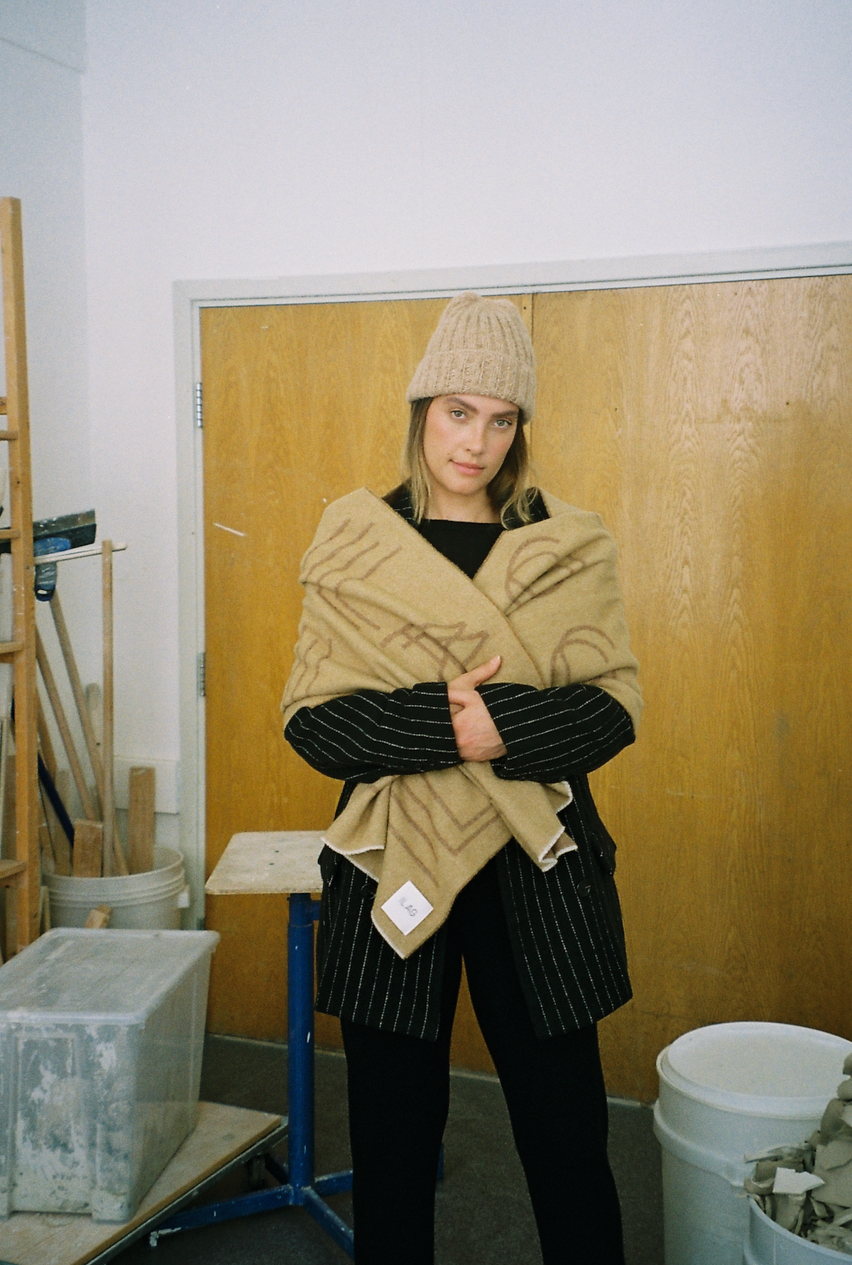 Buholmen scarf fra ILAG er vevet i tofarget resirkulert ullblanding. Skjerfet er 140 cm langt og 60 cm bredt, bruk det som skjerf, poncho eller et pledd, du bestemmer.