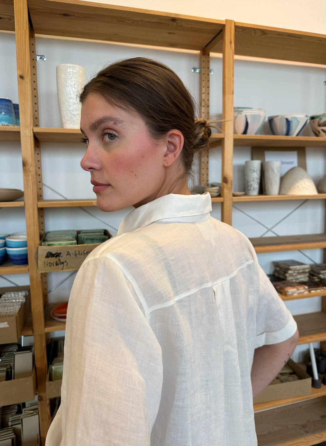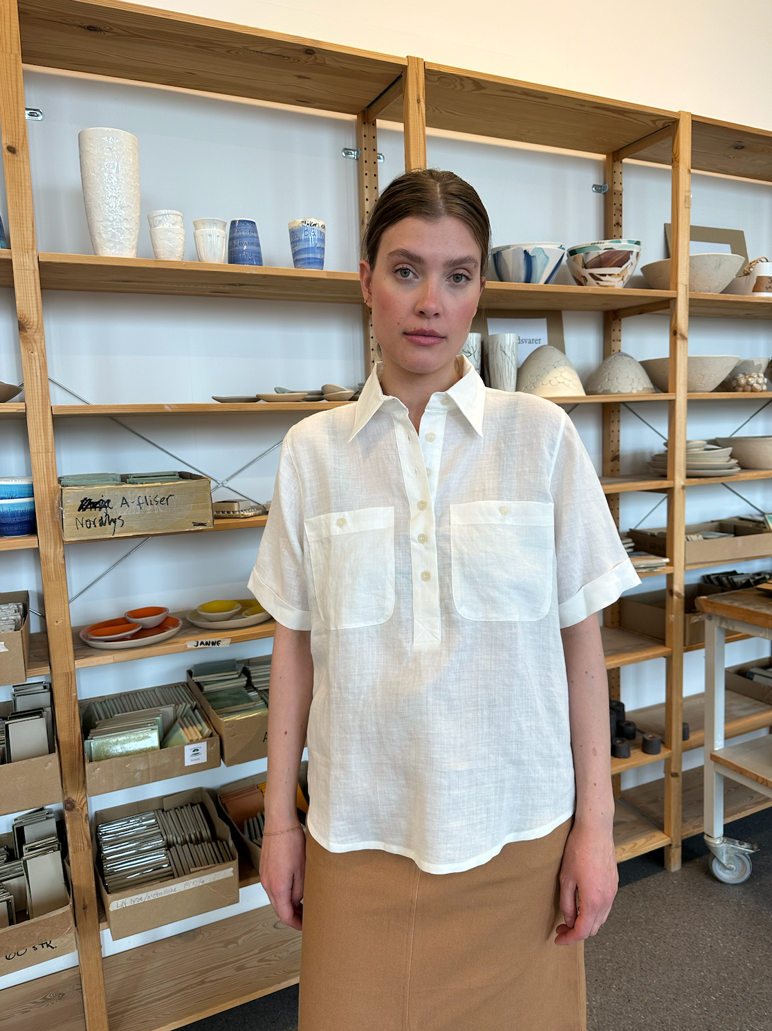 Shirt Short Sleeve Linen Re- er en løs og ledig sommerfavoritt. Den har rett passform, knappestolpe foran, brystlommer og krage med snipp. Skjorta er tidløs og passer til det meste. Denne kan du bruke gang etter gang, sesong etter sesong.