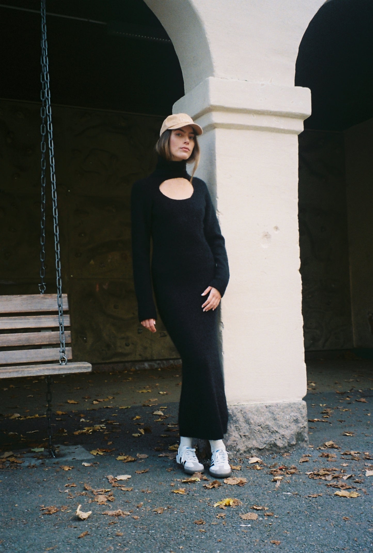 ILAG Julyred dress er en lang ribbestrikket kjole med cut-out detalj på brystet. Kjolen har lange armer med en bred ribb nederst på armen. Høy hals som du kan brette ned. Kjolen er smal i passformen og sitter som et skudd. Kjolen er normal i størrelsen.